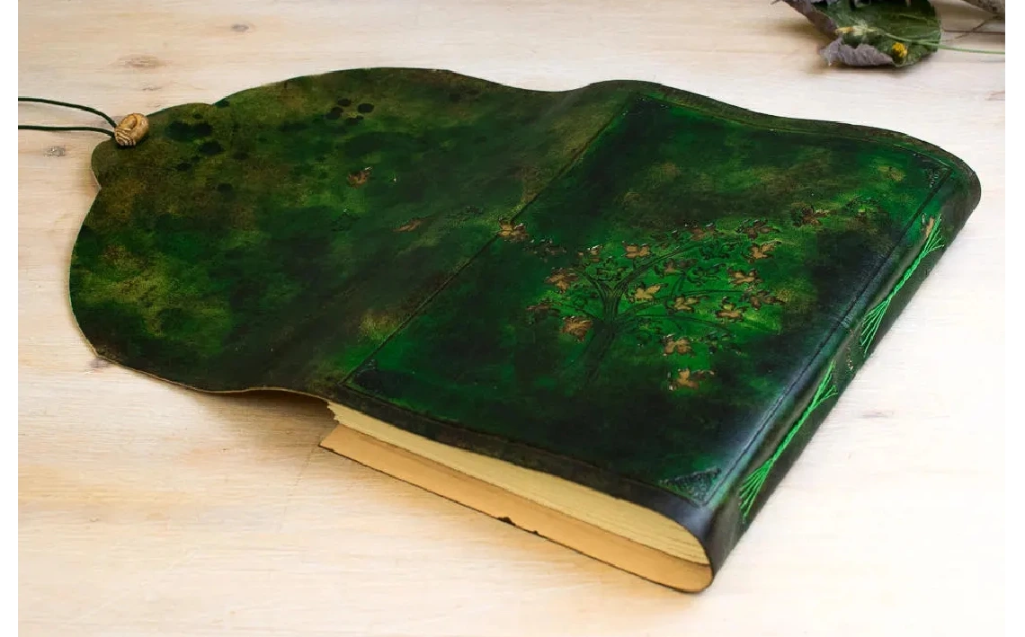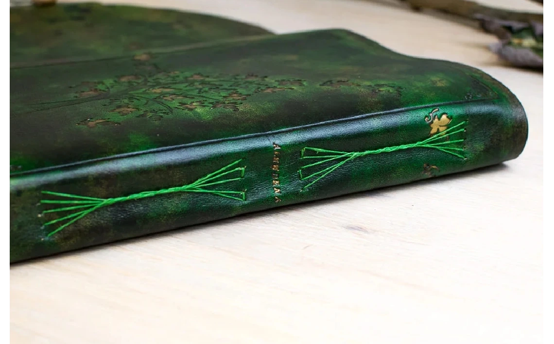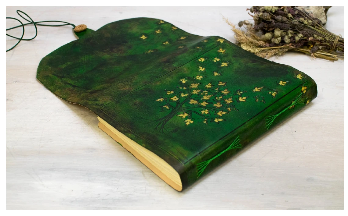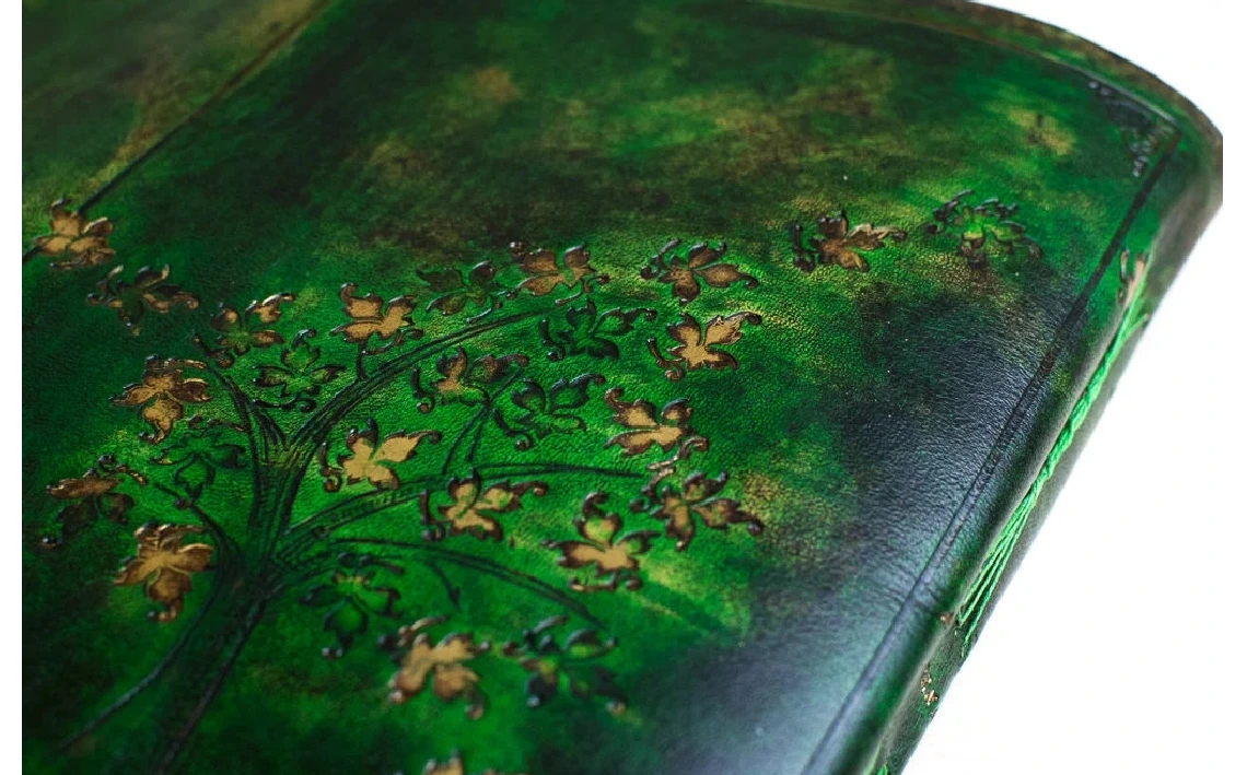 Cuaderno artesanal verde bosque en piel con motivo de árbol de la vida, tapa blanda Arbor Vitae