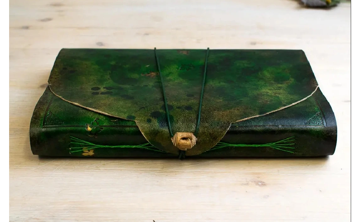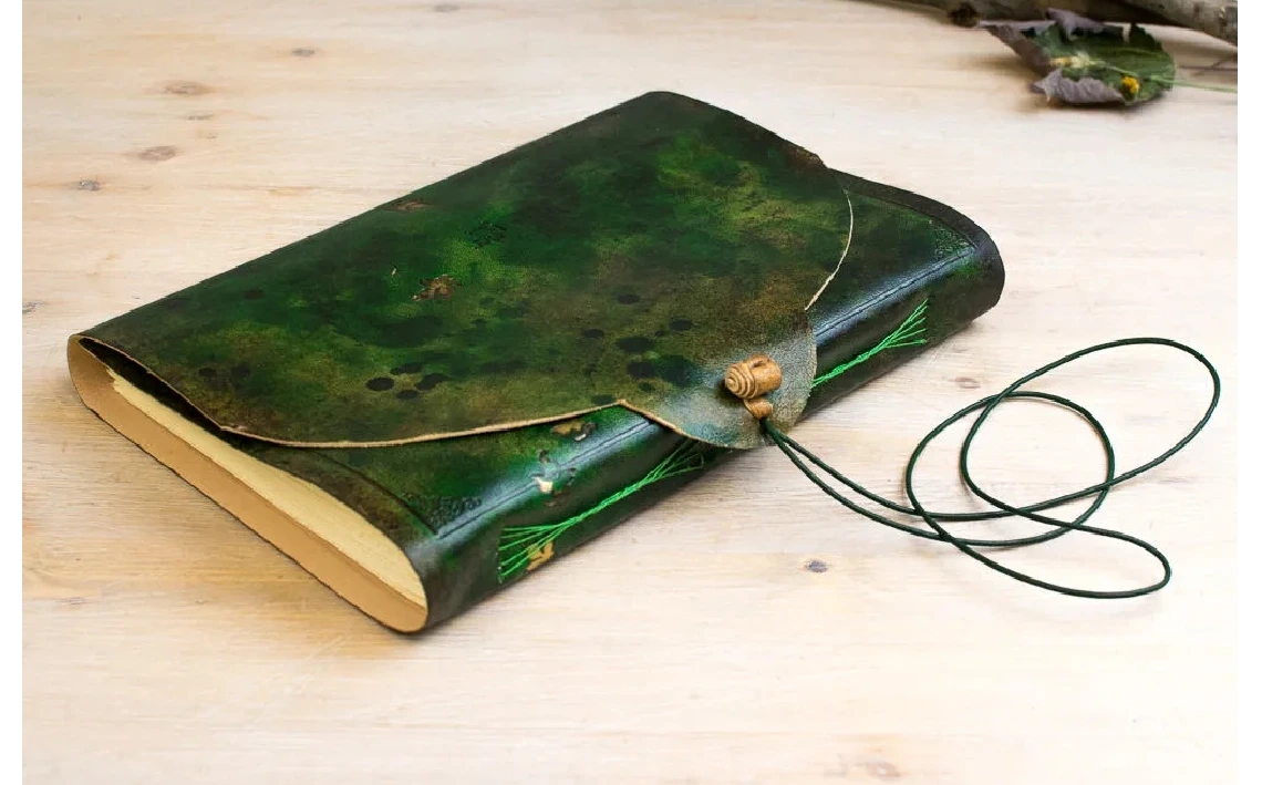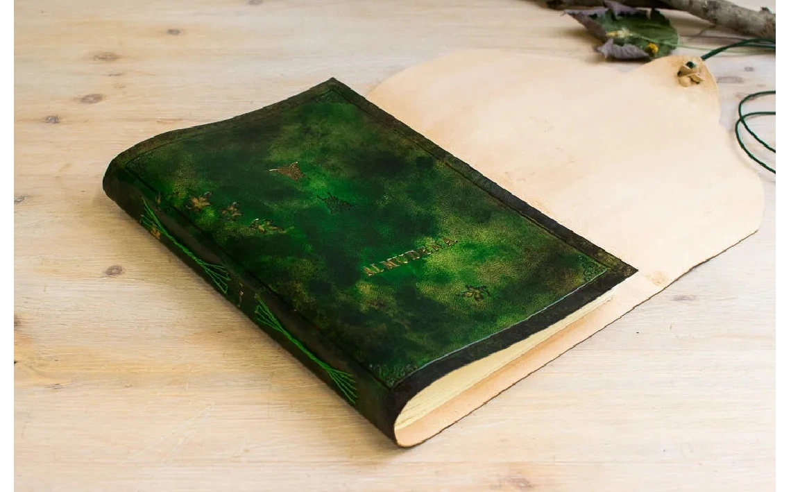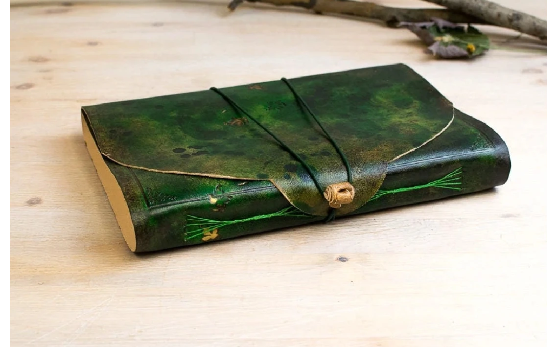 Soy un libro, y estoy hecho a mano con materiales naturales, mi tamaño es en formato B5, mi tapa es blanda y tengo un cierre artesanal ideal para proteger mi contenido, además de parecer natural y bonito por mi diseño verdoso Arbor Vitae.