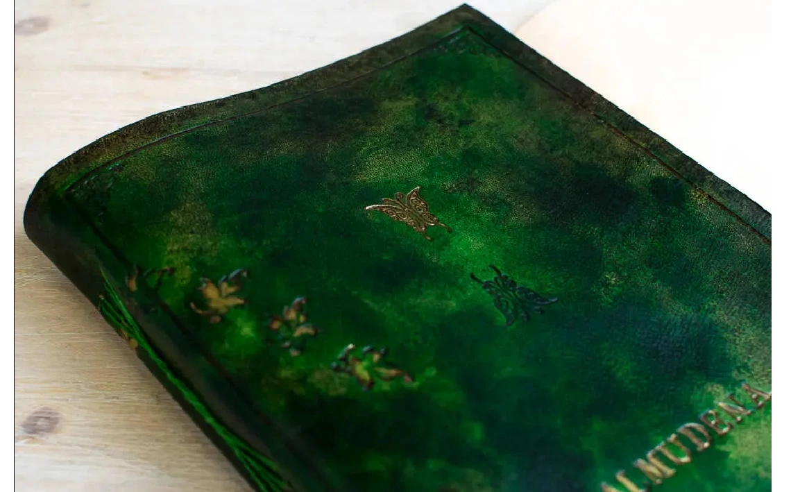 Cuaderno B5 en piel verde, grabado a mano con Árbol y mariposas. Personalizable, cosido artesanalmente, papel premium para escribir, dibujar o guardar recuerdos.