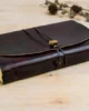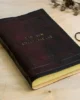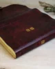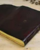 Cuaderno artesanal B5 en cuero borgoña con grabado dorado, personalizable, papeles premium y encuadernación gótica victoriana.