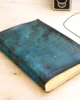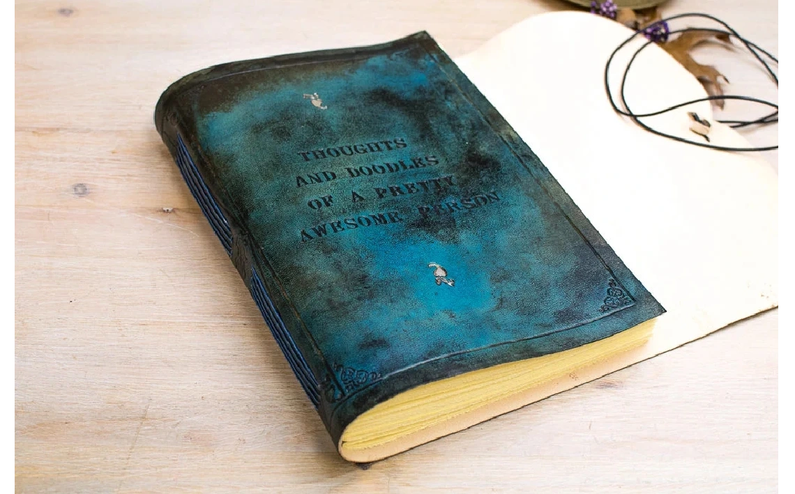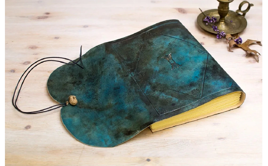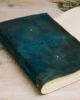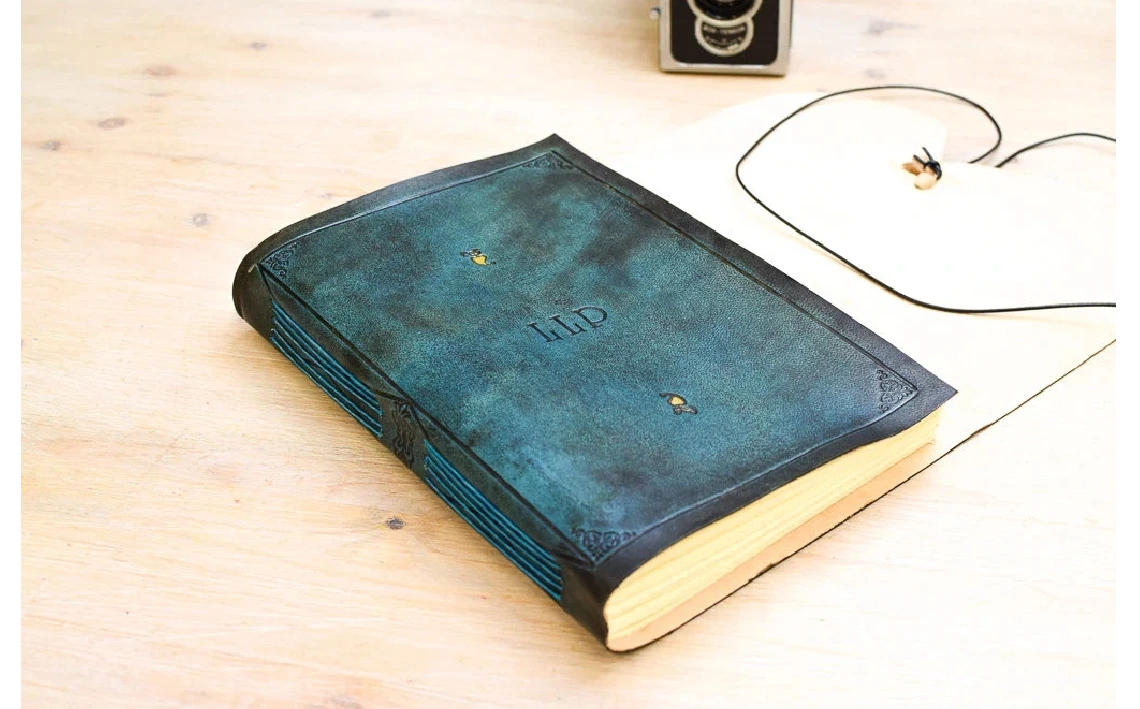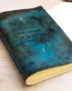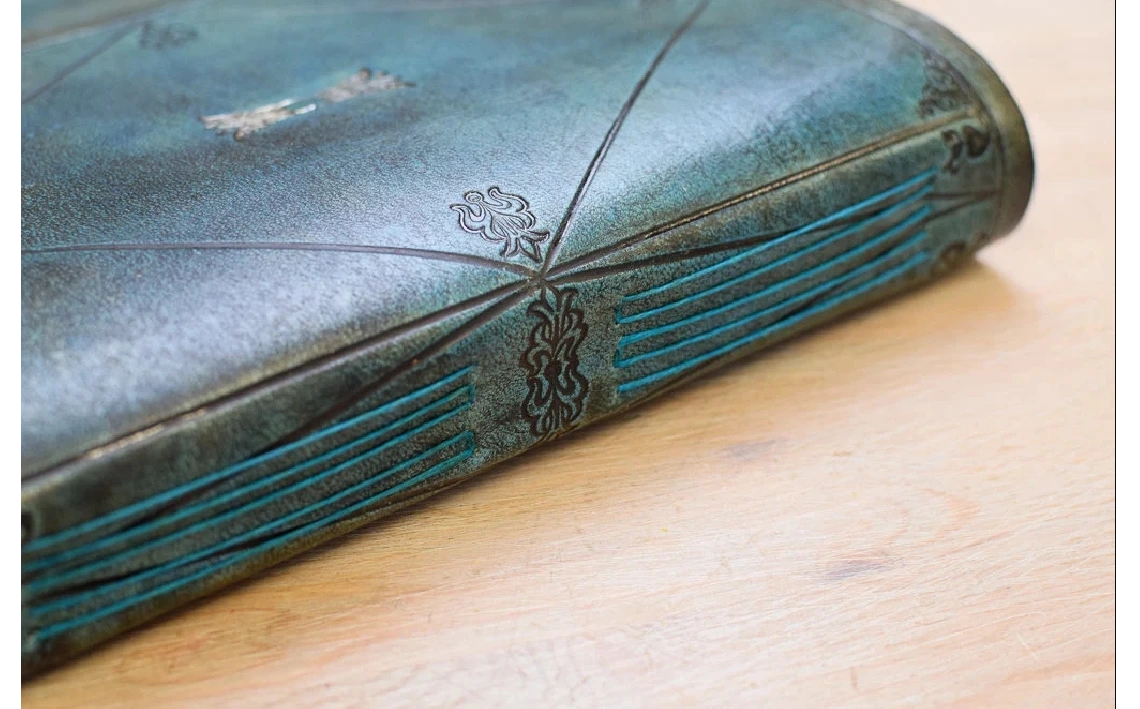 Piel blanda en delicado tono turquesa, con grabados plateados y una mariposa en la cubierta.