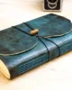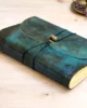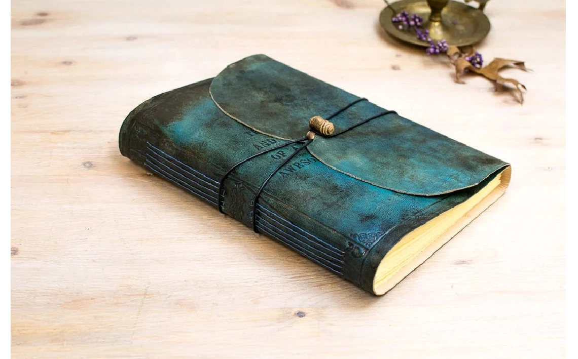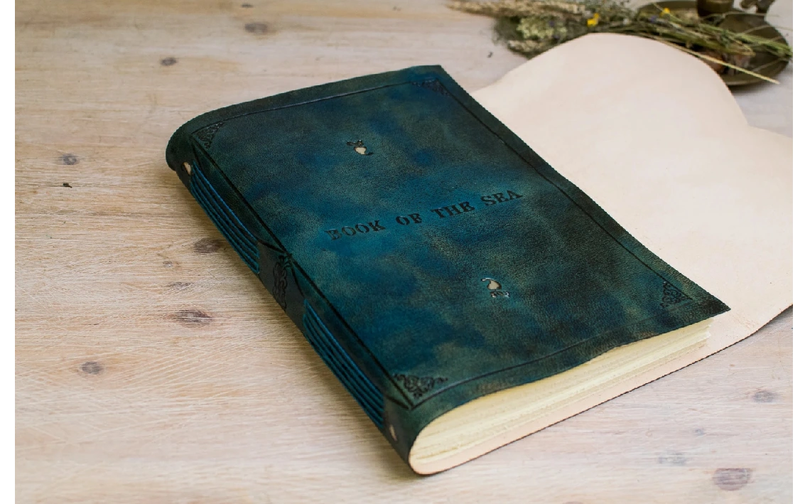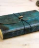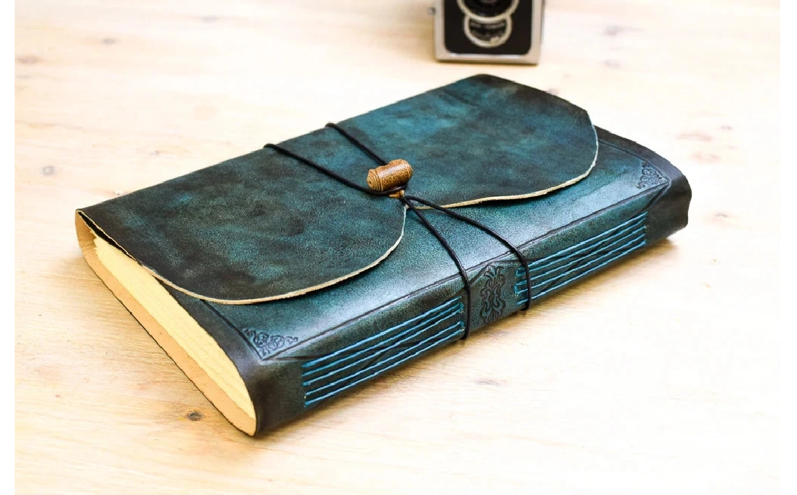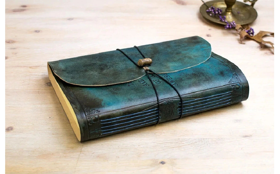 Piel blanda en delicado tono turquesa, con grabados plateados y una mariposa en la cubierta.