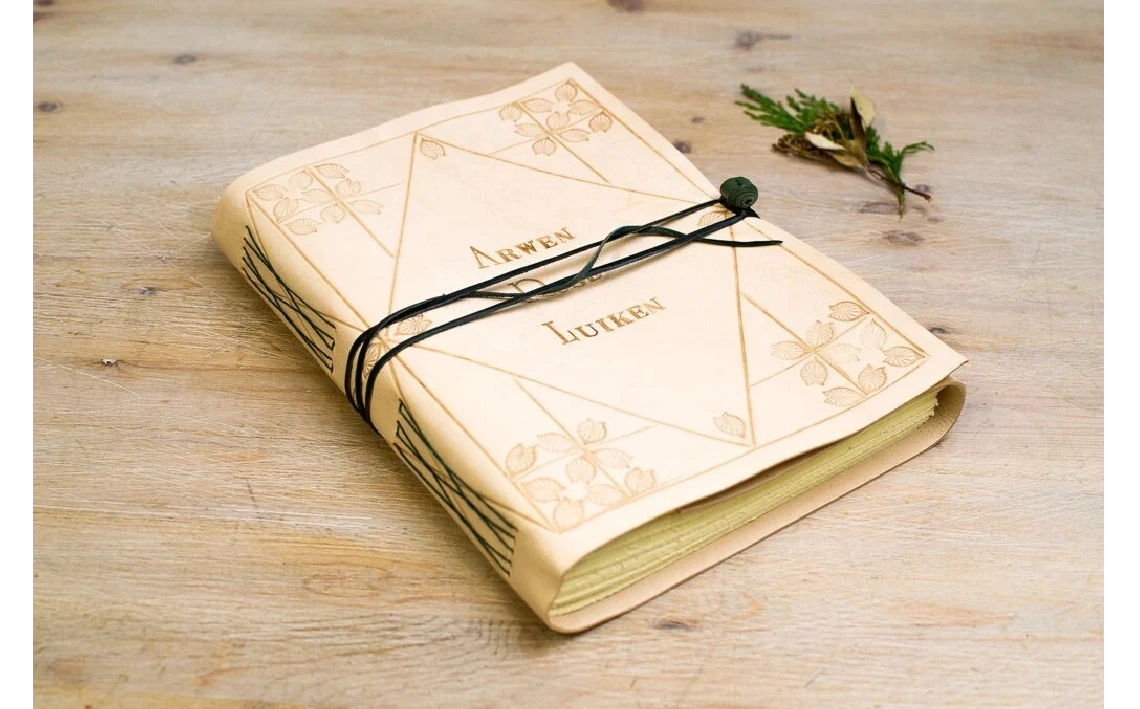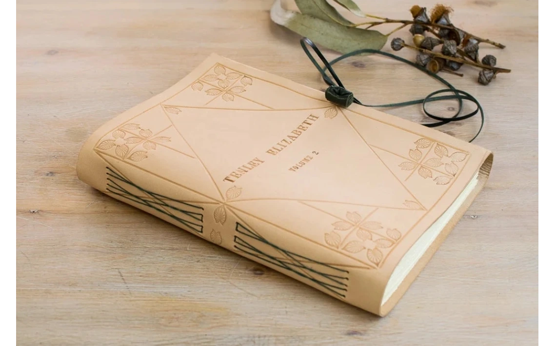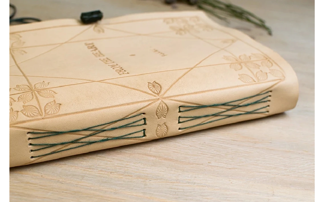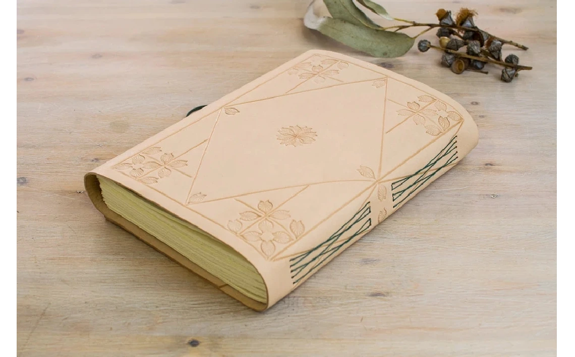 Mi piel de tono blanco roto, trabajada a mano, luce bellos motivos de hojas gofrados con herramientas de encuadernación tradicionales, uno a uno, sin máquinas.