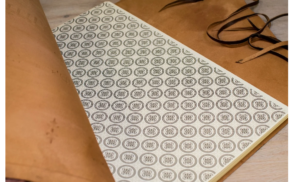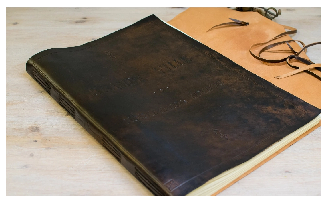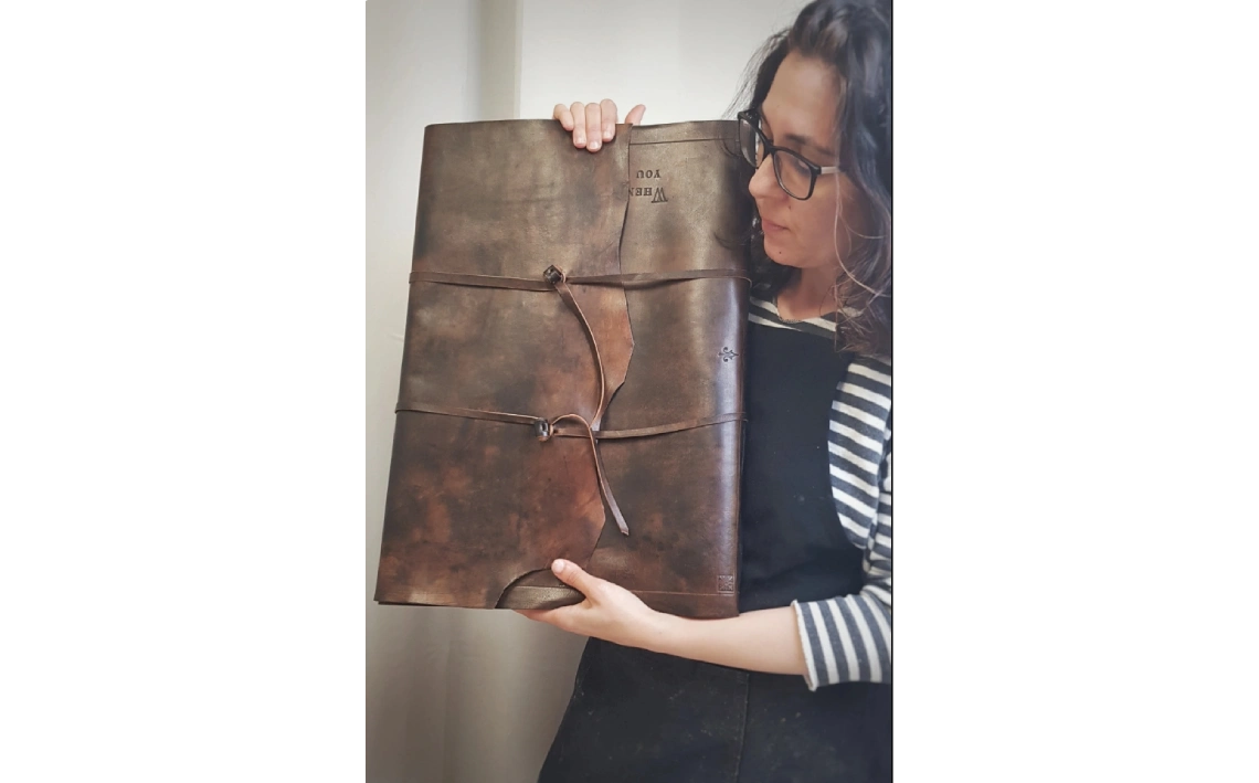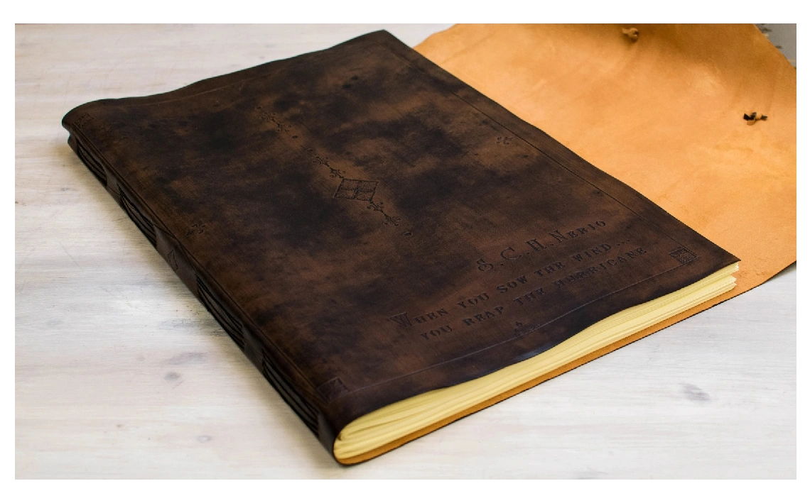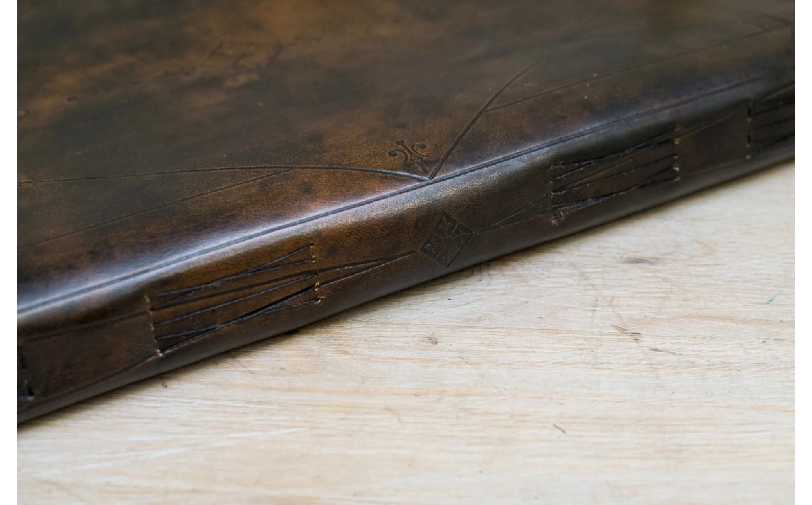 Mi cubierta de cuero puede llevar un extracto literario, poema, cita o palabras que tú elijas, grabadas a mano — hasta 40 palabras.