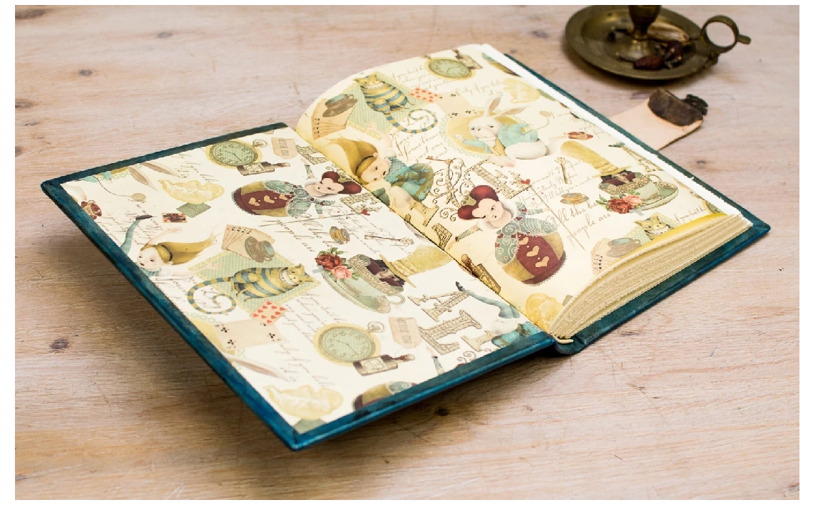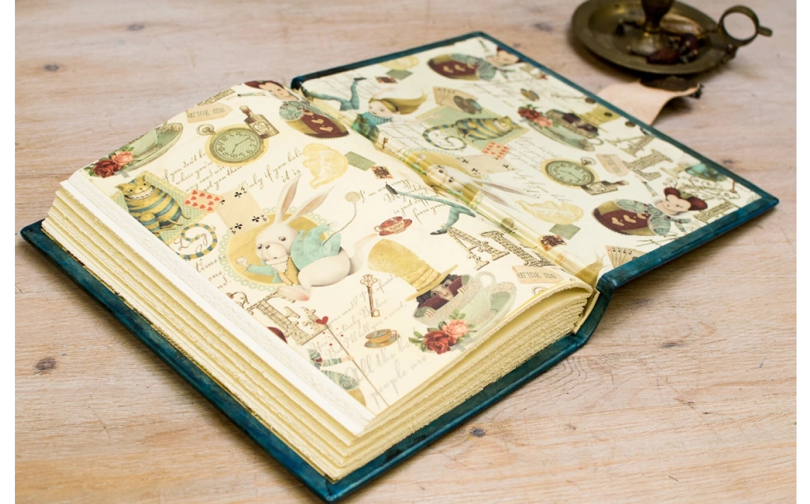 Soy un libro muy especial diseñado con temática de Alicia en el país de las maravillas, tengo una tapa dura que me hace robusto y me da la calidad y durabilidad necesarias, en ella hay varios motivos del cuento infantil.