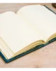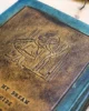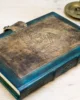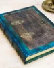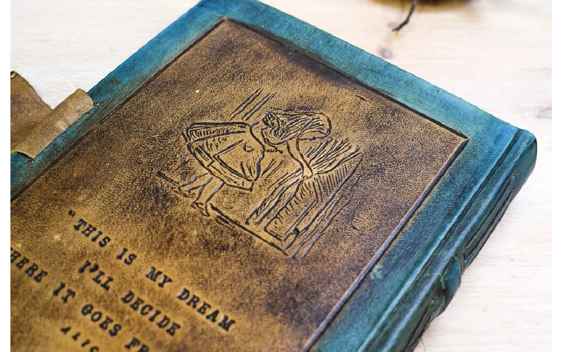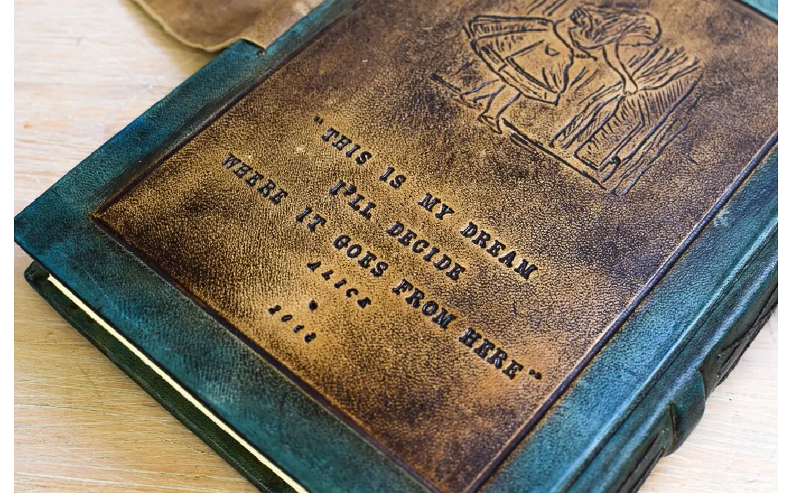 Mi cubierta de cuero turquesa, marrón y cobre puede llevar un mensaje grabado (hasta 20 palabras) justo debajo de la ilustración de Alicia.