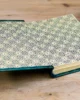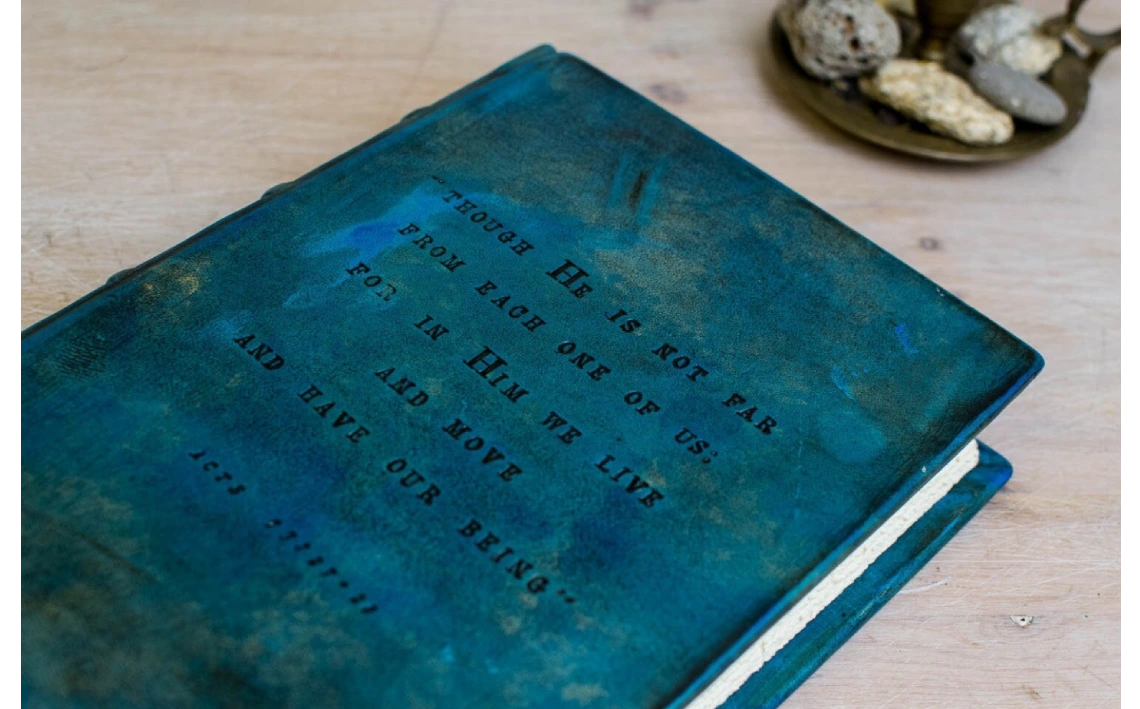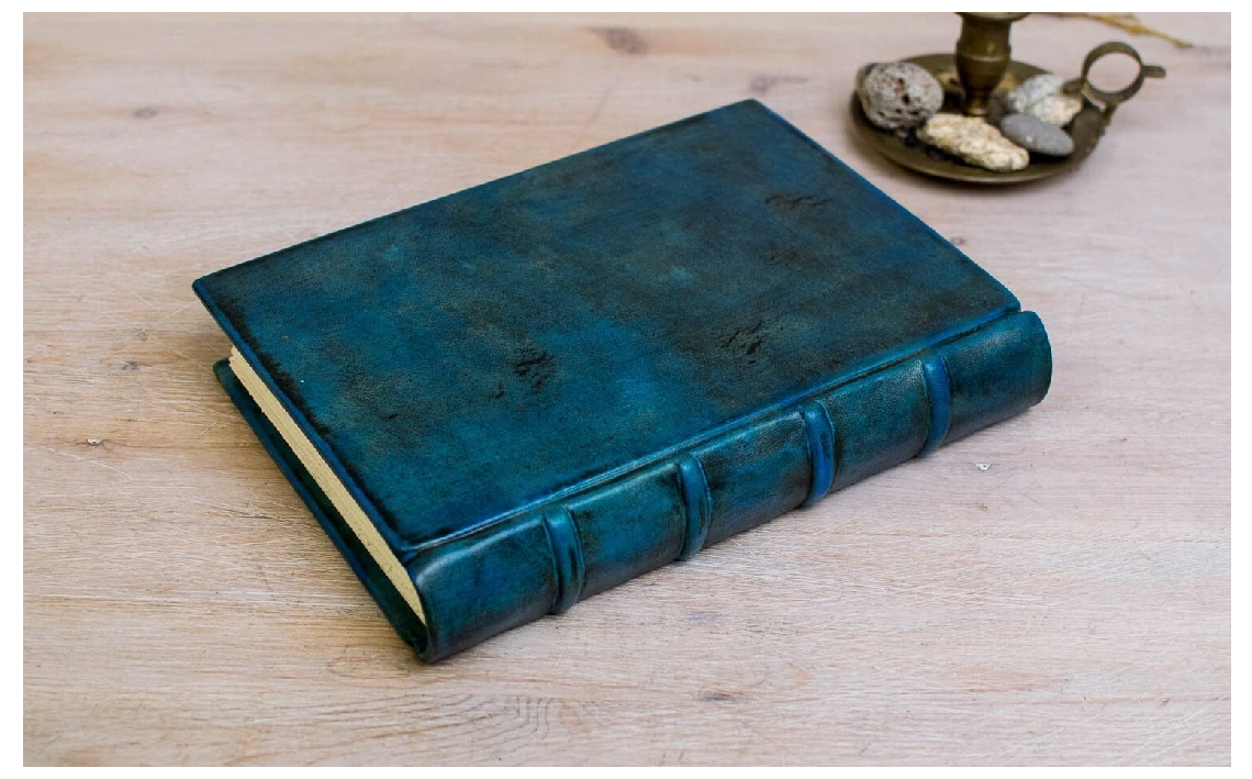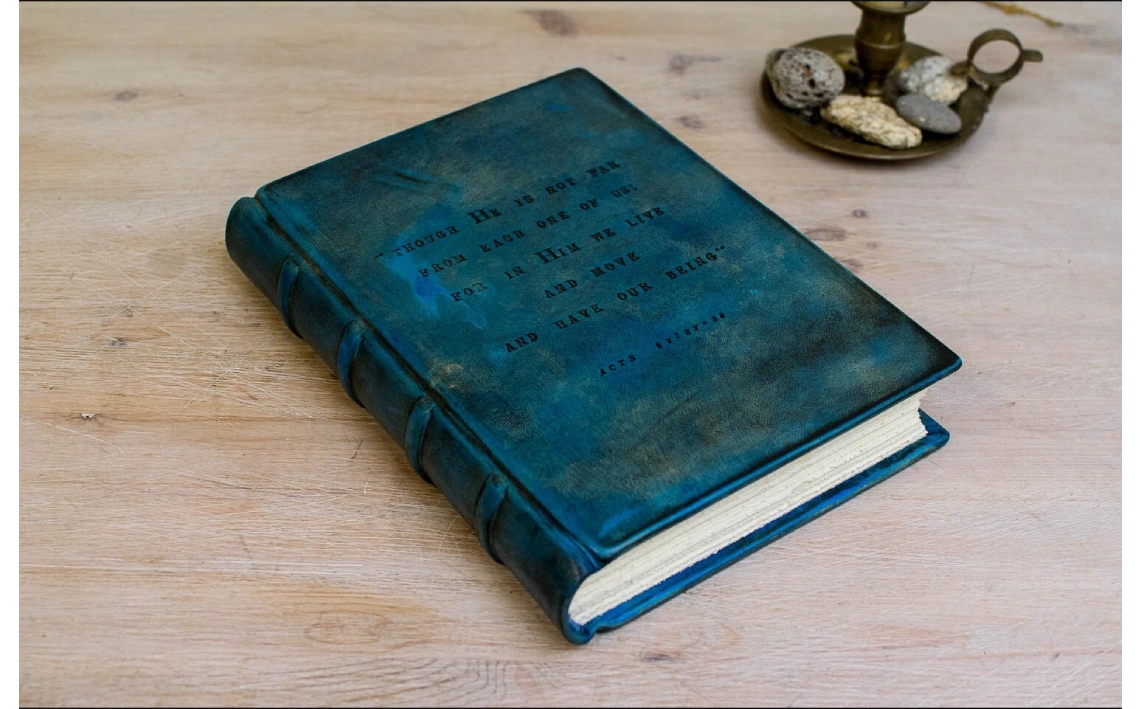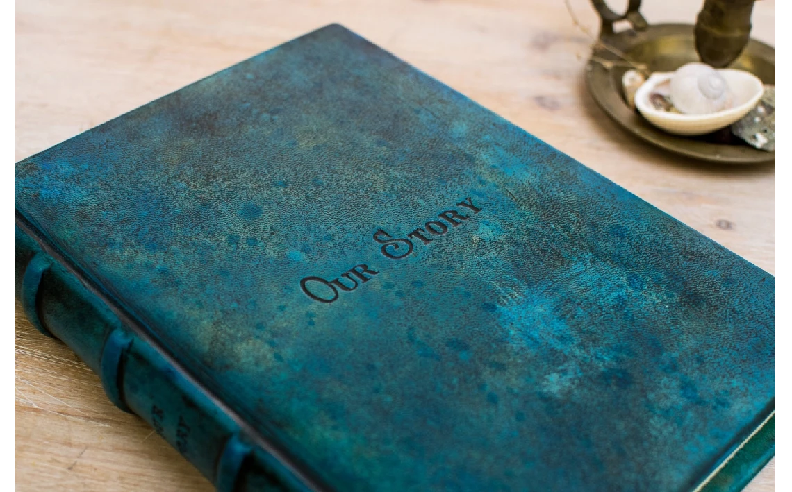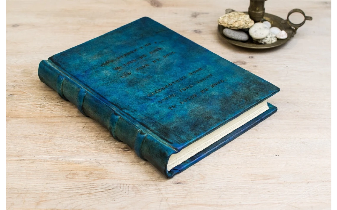 Mi cubierta de piel azul turquesa, romántica y elegante, puede llevar un texto grabado a mano de hasta 25 palabras.