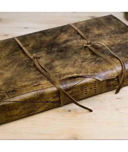 Soy un libro que destaca por su belleza clásica, ya que estoy envejecido a mano, y creado artesanalmente. Mi tamaño B5 me hace portátil, lo cual es ideal para un cuaderno como yo.