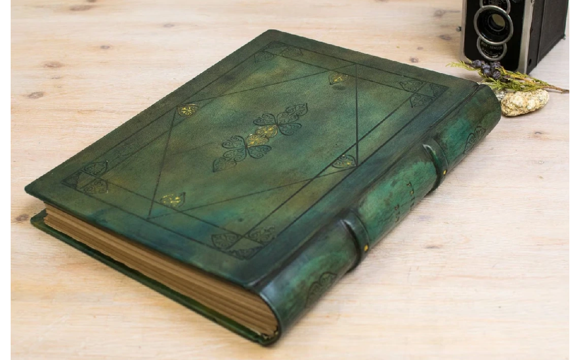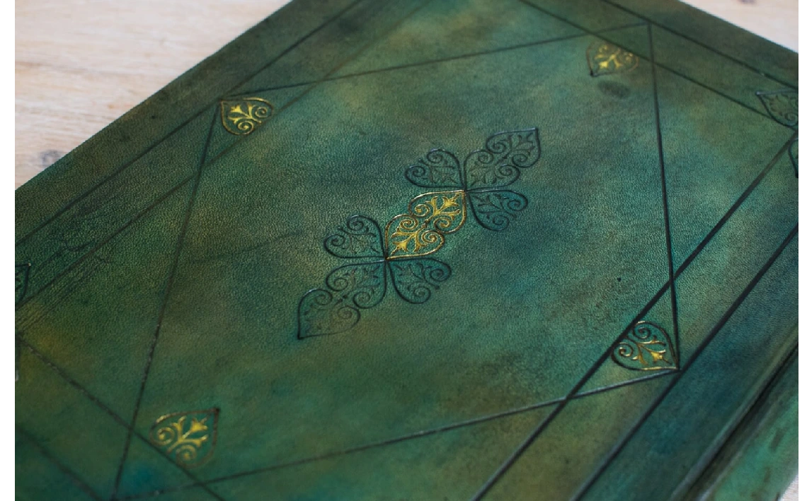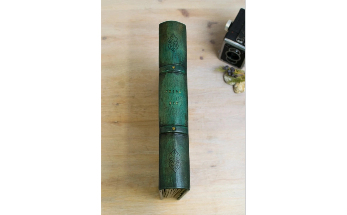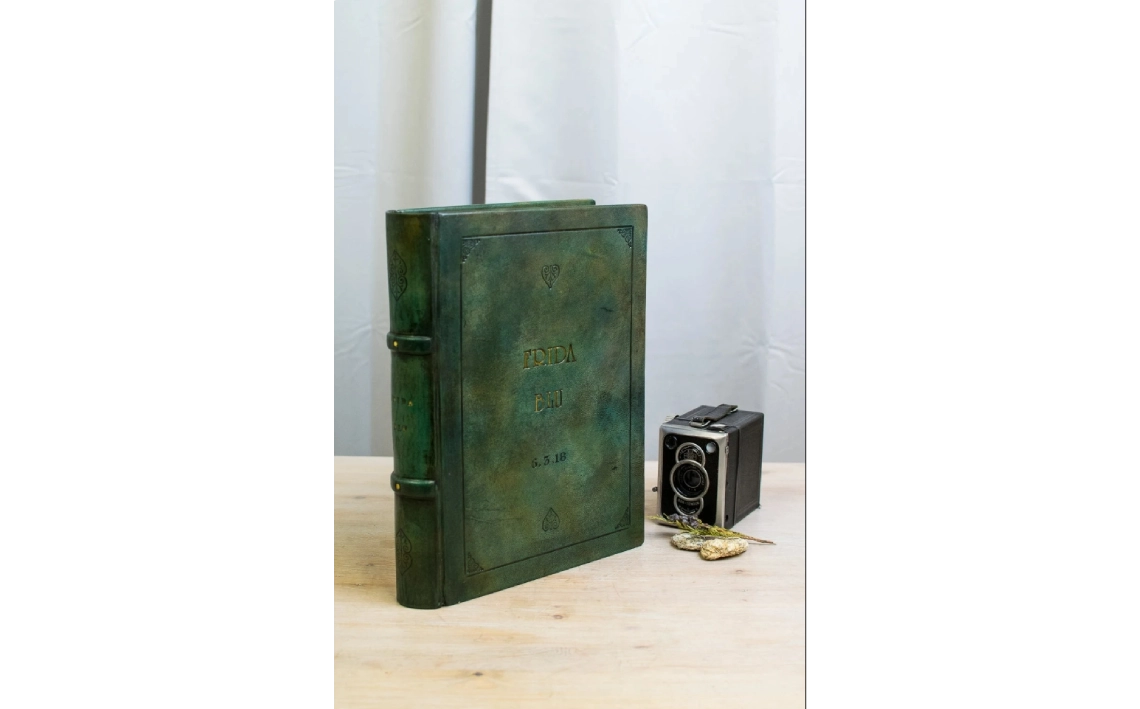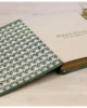 Soy un libro de estilo Lotus Blu, con tapa dura y formato B4 presumo de mis tonos verdes que ofrecen un aire natural y clásico.